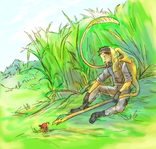 少年が着てるのはもろに草刈りの時の装備。さらにかぶり笠があれば最強。他の生物の背中にしがみつきながら尻尾で邪魔な草を刈って歩きやすい道を作ってやり、自分は草を刈った後に飛び出してくる虫とか鳥とかを食べて生活してるとかそんな感じだと思う。