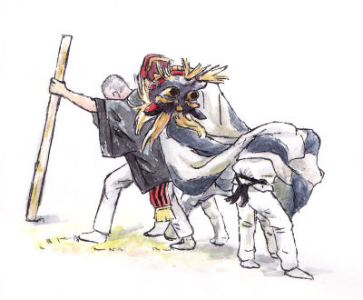 上の絵は調子に乗った獅子を警護棒を持った獅子使いが諌めてる時の。