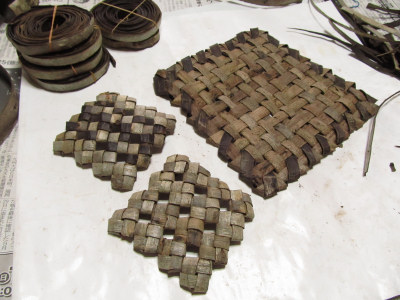 水につけてやわらかくした樹皮をテープ状に切って編んだり結んだり。