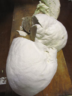 オニフスベという名のキノコです。人の頭くらいの大きさはありました。畑とかにたまーに生えてたりするのですが、オニフスベが食えるらしいという噂は前々から耳にしていて、似たような毒キノコも存在しないそうなので、まあ、せっかくだし、試してみようかなんてつい思ってしまったのでした。
