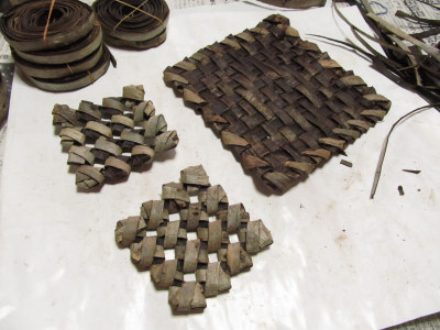 水につけてやわらかくした樹皮をテープ状に切って編んだり結んだり。