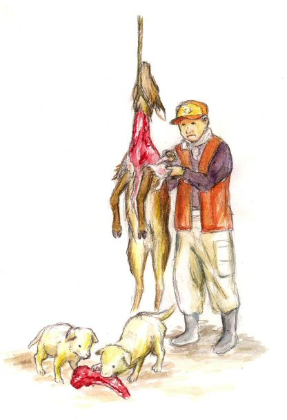 可愛らしい子犬(猟犬の子供)が血まみれでシカの頭引っ張ってるのを見たときはちょっとビビりました。