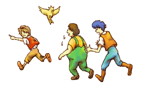 「マーヴェラス~もうひとつの宝島」より主人公3人とピラック鳥。
